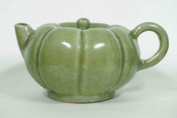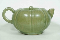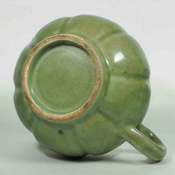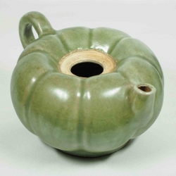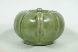 Large and very rare Longquan celadon pumpkin shaped ewer. The body is divided into two sections joining at the waist. Perfect condition. All lids and handles are still intact. |